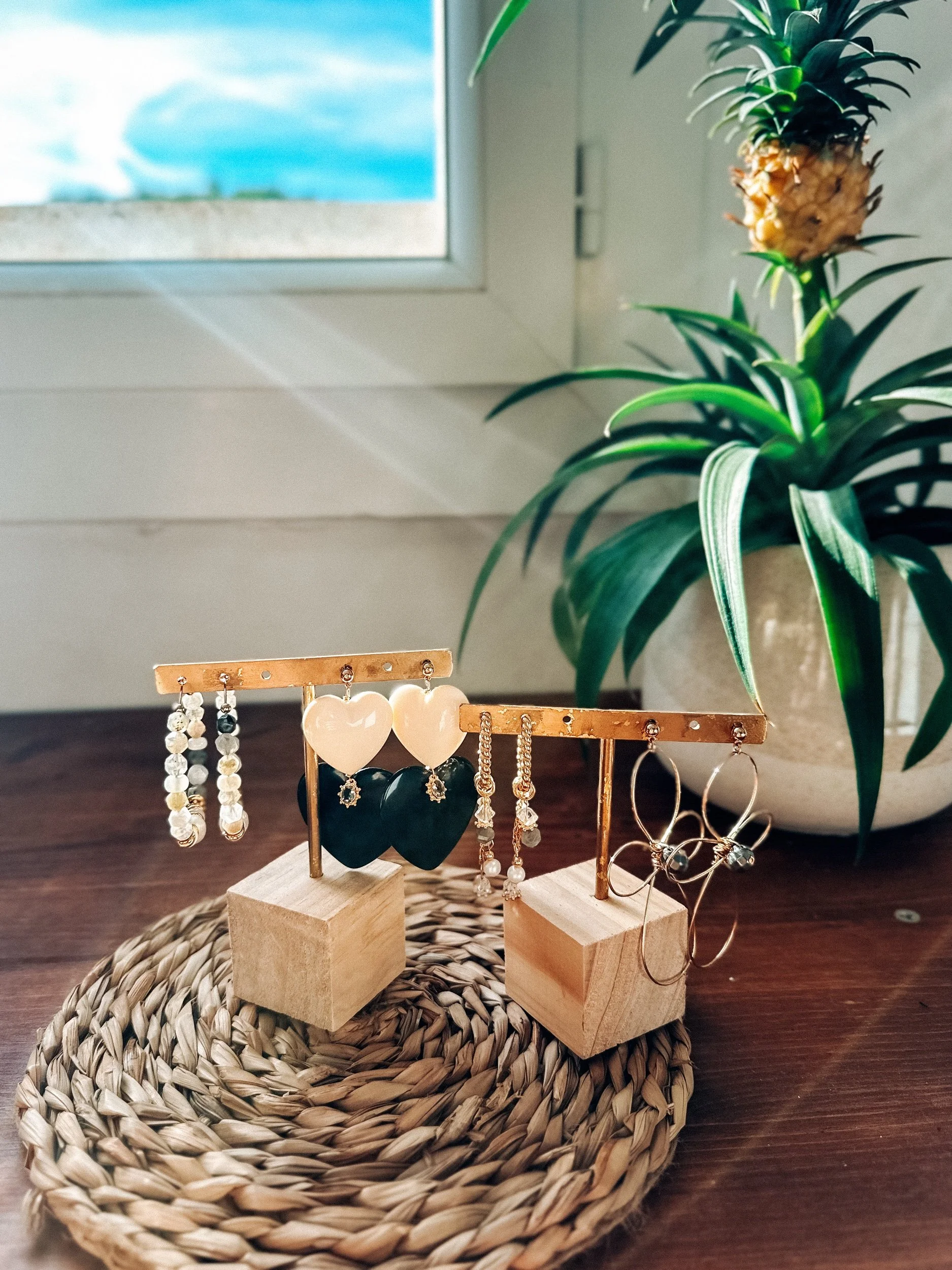 Ces créoles torsadées sont composées de breloques en pierres naturelles. Vous trouverez de la labradorite, du cristal Herkimer (cristal de roche d’une grande pureté), de pierres de lune, de perles de culture d’eau douce et de perles en plaqué or.